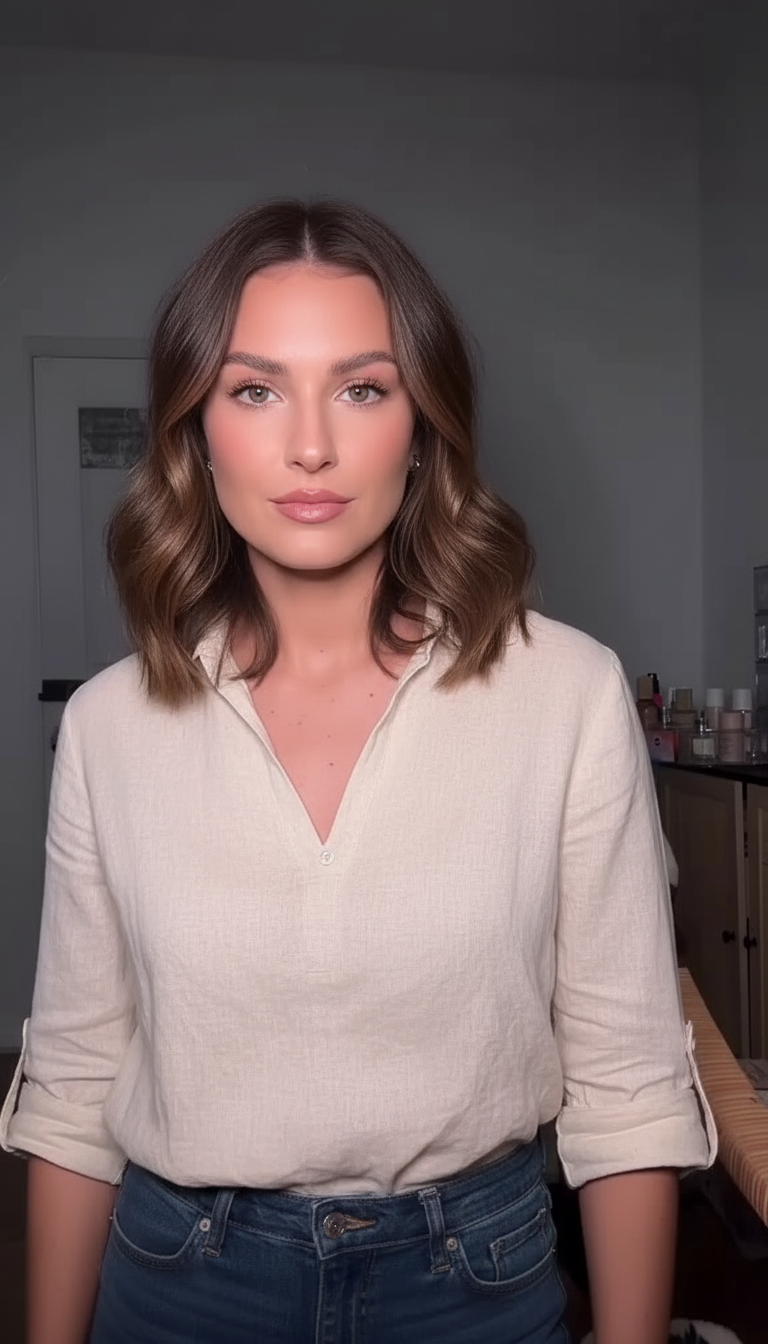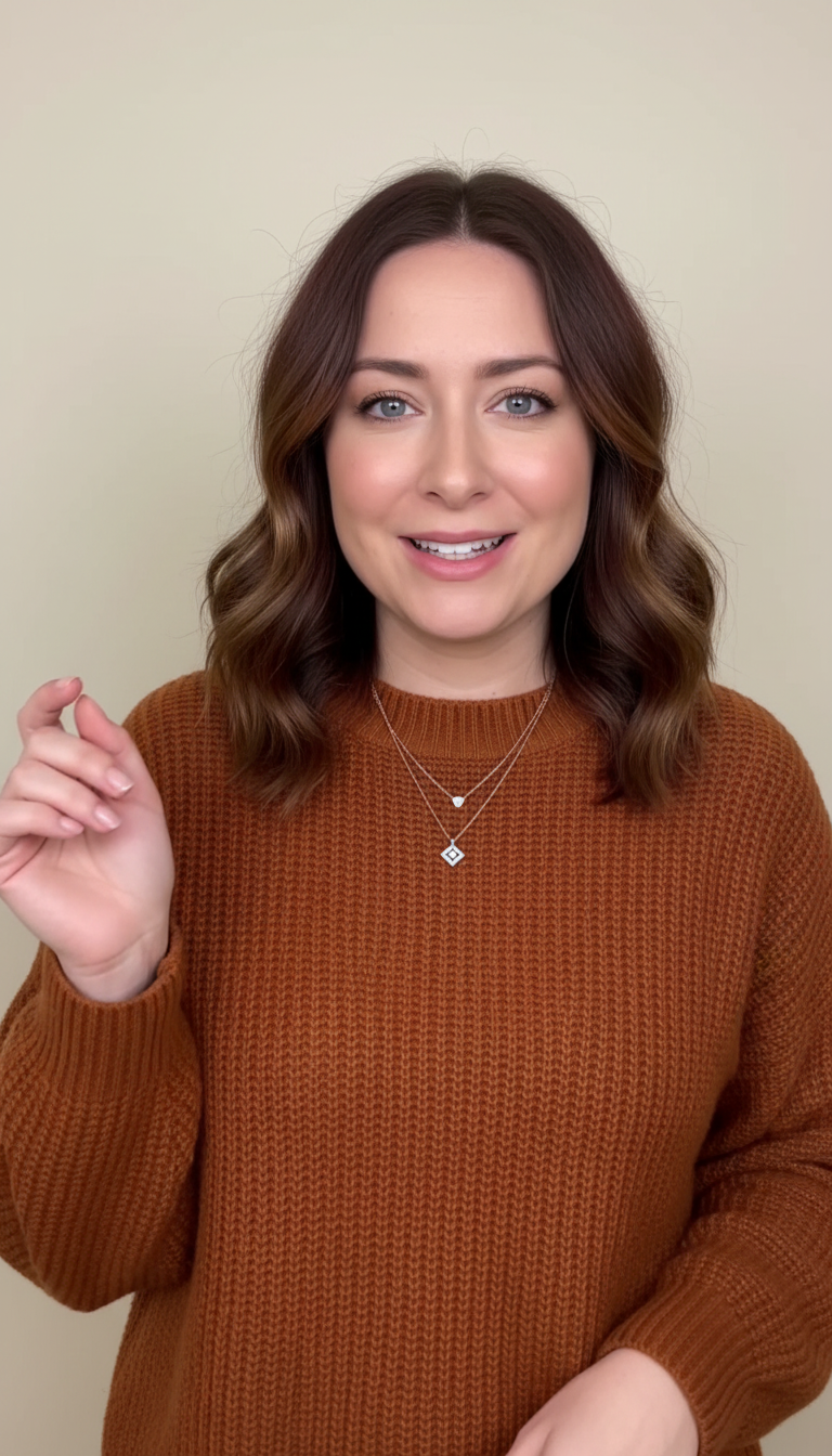 The woman with shoulder-length wavy brown hair holds a jar and follows a defined hand-motion path.
