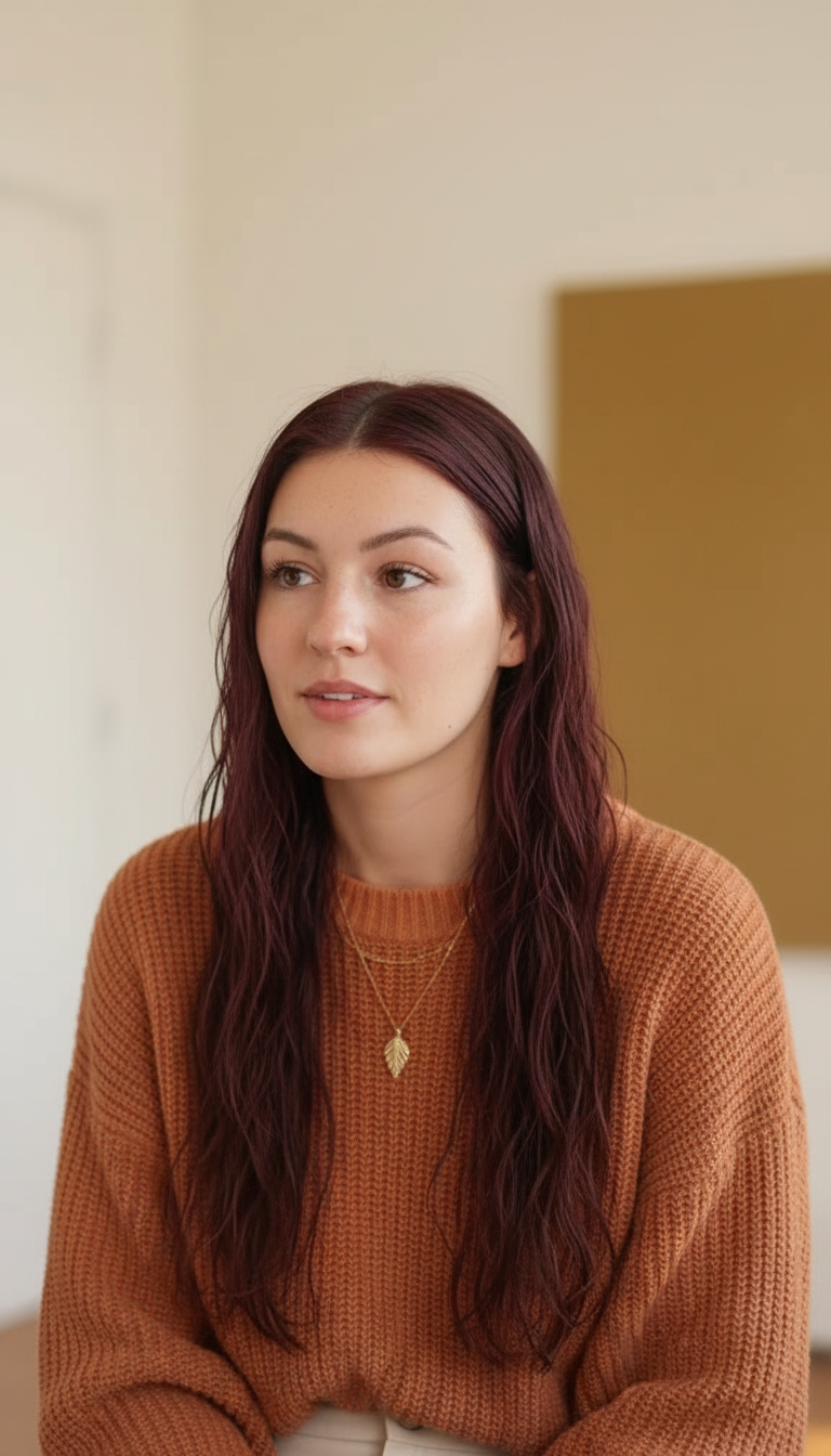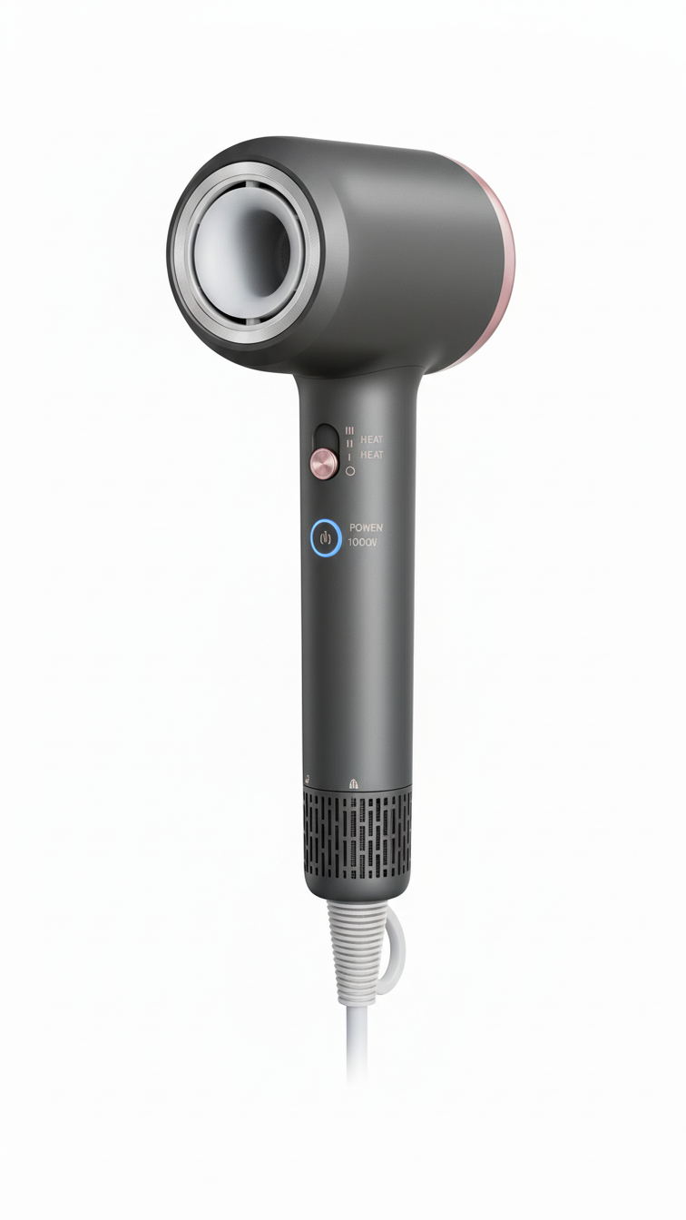 The young woman with long, wavy dark red hair is holding a sleek black and rose gold hairdryer.